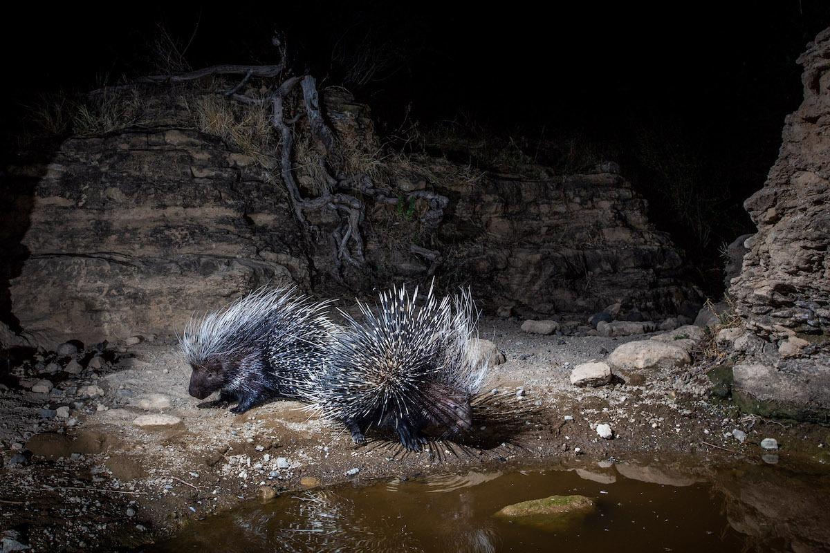 Shomphole Hide ๋ ๋ค๋ฅธ ์์์์ ๋ฉ๋ฆฌ ๋จ์ด์ง ์ธ๊ณต ๊ธ์ ๊ตฌ๋ฉ์ ๋๋ค. ๋ฌผ์ ๊ตฌ๋ฉ์ด์ ํจ๊ป Burrard-Lucas์ ์ง๋ ํ์ ํ์ ์ฌ๋๋ค์ด ๋ฌผ์ ๋ง์๋ฌ ์ค๋ ๋๋ฌผ์ ๊ด์ฐฐํ๊ณ ์ฌ์ง์ ์ฐ์ ์ ์๋ ์์ ์ฒ๋ฅผ ๋ง๋ค์์ต๋๋ค. ๊ธ์๊ตฌ๊ฐ ์๊ธด ์ง ์ผ๋ง ๋์ง ์์ Burrard-Lucas๋ ์นด๋ฉ๋ผ ํธ๋ฉ์ ์ค์นํ์ฌ ๋๋ฌผ๋ค์ด ์๋ก์ด ๋ฌผ ๊ณต๊ธ์์ ๋ํด ์ด๋ป๊ฒ ์๊ฐํ๋์ง ํ์ธํ์ต๋๋ค.
