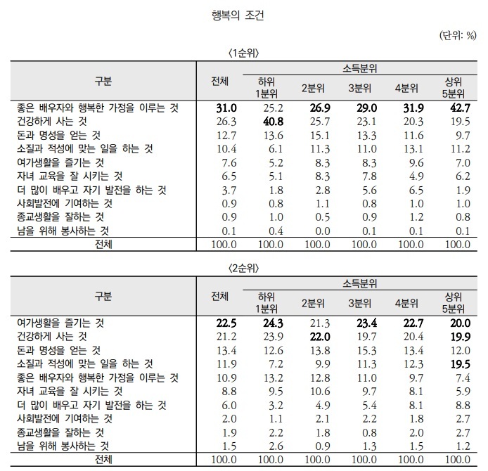 ๋ค์์ ‘๊ฑด๊ฐํ๊ฒ ์ฌ๋ ๊ฒ(26.3%)’, ‘๋๊ณผ ๋ช ์ฑ์ ์ป๋ ๊ฒ(12.7%)’, ‘์์ง๊ณผ ์ ์ฑ์ ๋ง๋ ์ผ์ ํ๋ ๊ฒ(10.4%)’, ‘์ฌ๊ฐ์ํ์ ์ฆ๊ธฐ ๋ ๊ฒ(7.6%)’์ ์์ด์๋ค.